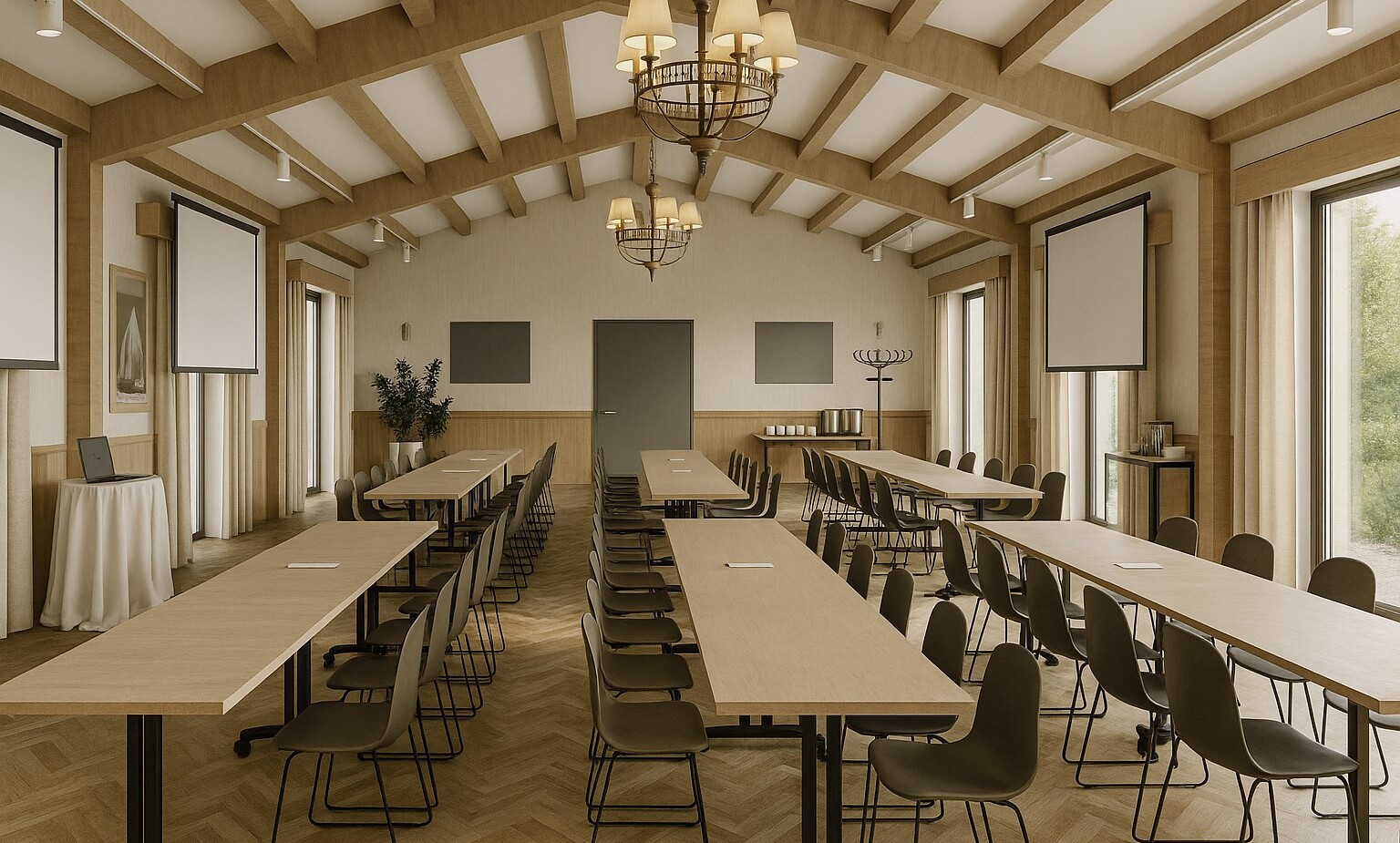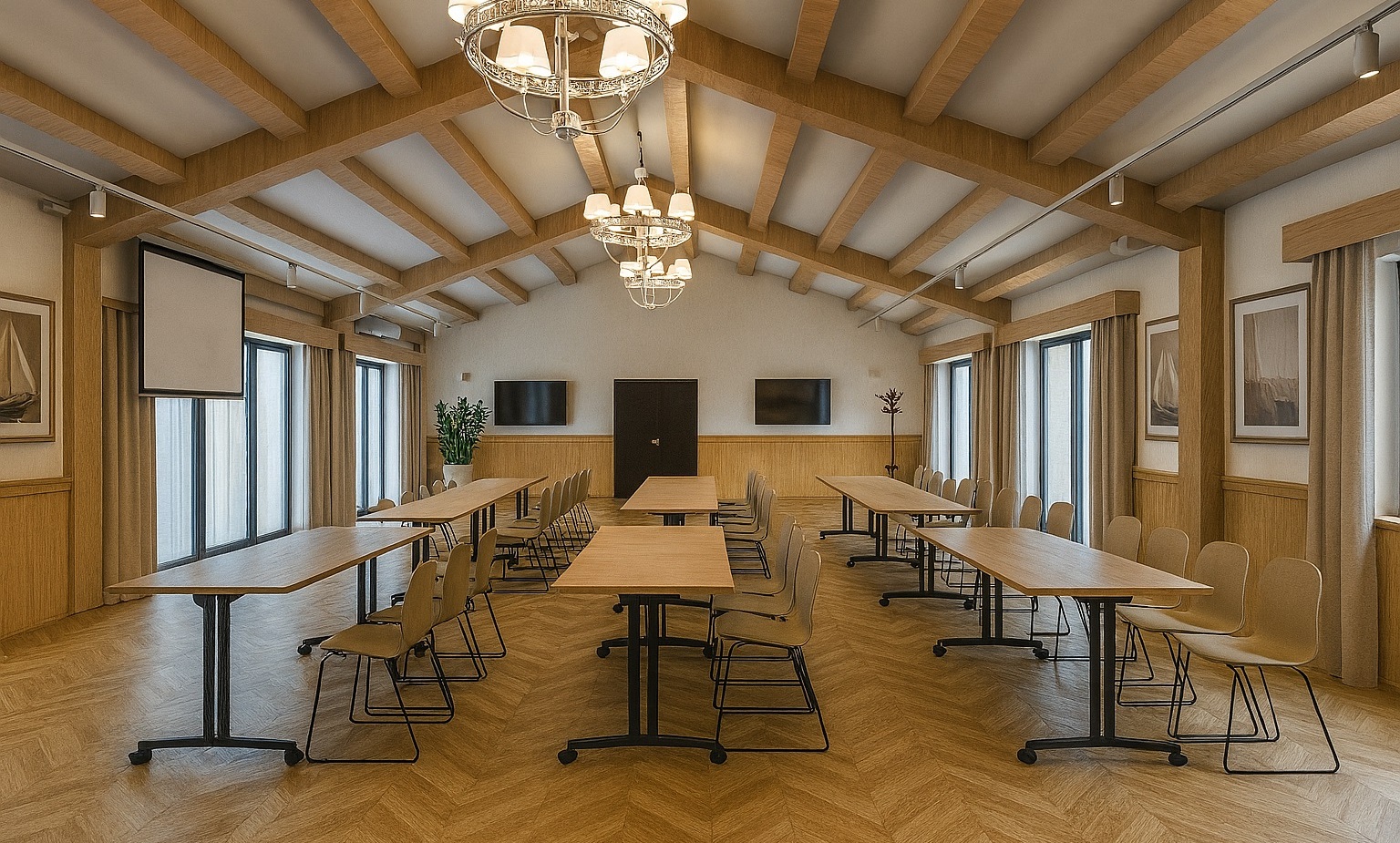 - Sala Kapitańska (45 m²) – idealna na warsztaty, szkolenia, kameralne konferencje do 40 osób. Wyposażona w nowoczesny ekran, klimatyzację, szybkie Wi-Fi, mikrofon i flipchart.